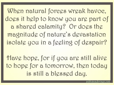 When natural forces wreak havoc, does it help to know you are part of a shared calamity? Or does the magnitude of nature’s devastation isolate you in a feeling of despair?