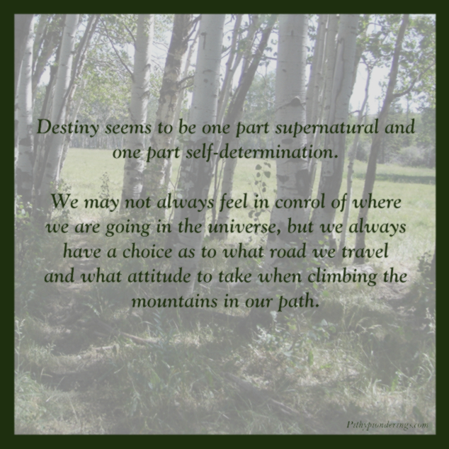 Destiny seems to be one part supernatural and one part self-determination. We may not always feel in control of where we are going in the universe, but we always have a choice as to what road we travel and what attitude to take when climbing the mountains in our path.